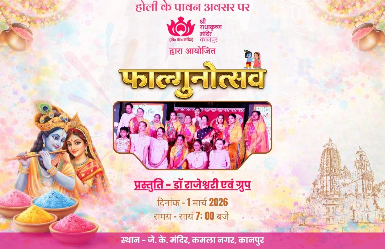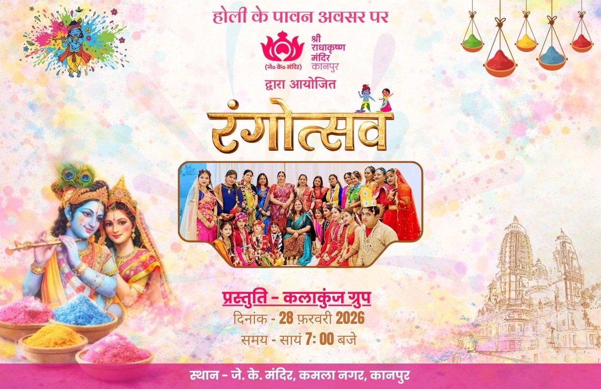 Shri Radhakrishna Temple, also known as J.K. Temple, is a major landmark in Kanpur and a must-see for visitors. Its grand steeple is a prominent feature of the skyline, attracting devotees from around the world over its sixty four-year history. The temple's regal appearance and serene, picturesque setting create a peaceful atmosphere amidst the bustling city. Situated on seventeen acres of lush greenery, the temple's design, including its five steeples representing five shrines, enhances its celestial and timeless charm. The five shrines that are housed in the Temple dedicated to Shri Radhakrishnaji, Shri Narmadeshwarji, Shri Ardhanarishwarji, Shri Lakshminarayanji and Shri Hanuman ji. The temple also houses an ancient copy of the Vedas, adding to its spiritual significance.